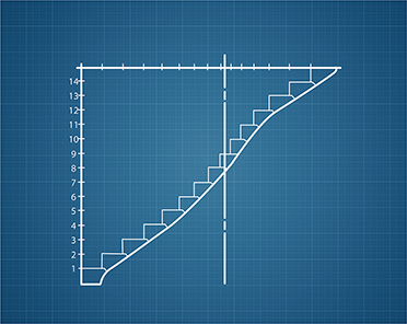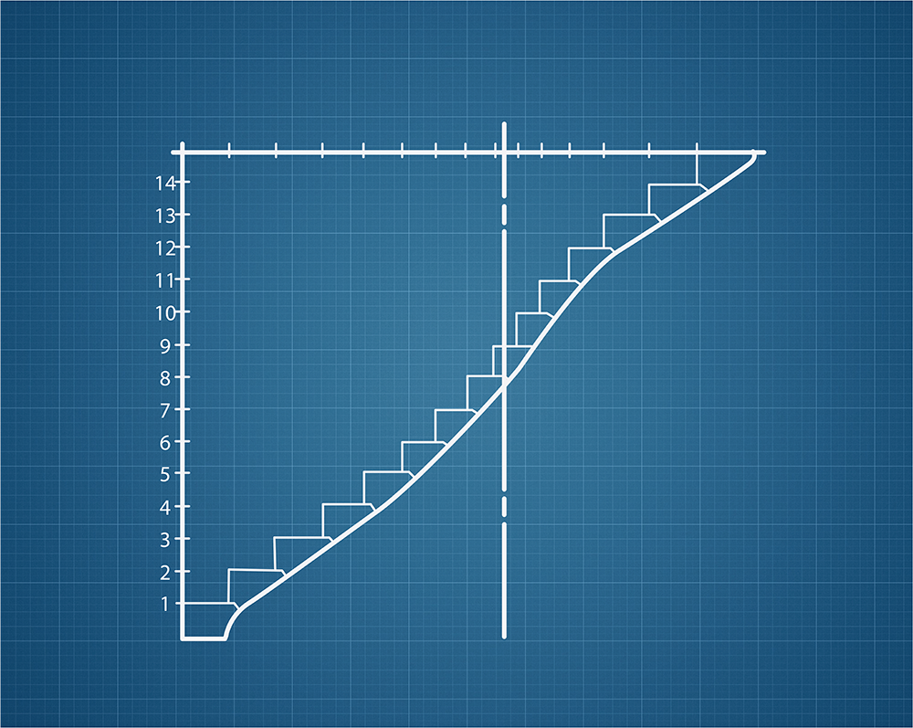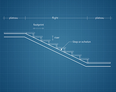 The Harrow method --> L stairs. This method proportionally reduces the read on the well side but keeps it constant on the walk line. To be efficient, this method requires that at least seven steps are wedge shaped: The one in the angle and 3 on each side.