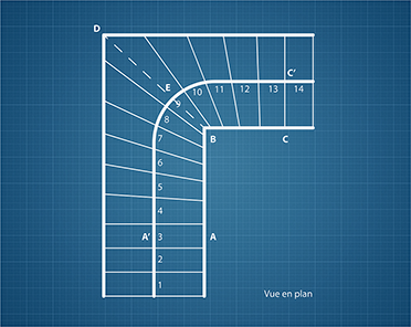 This L-shaped stair has 15 steps. The ninth being the one in angle. Steps are web shaped from the 3rd to the 14th. -> First, draw regular treads on the walk line. All the steps from A to C will be wedge shaped. - -> The BD line cuts the angle in the middle. E is the intersection point of BD and the walk line A'C'.
