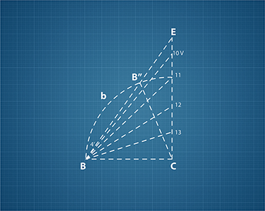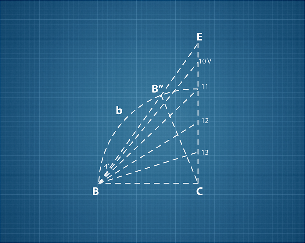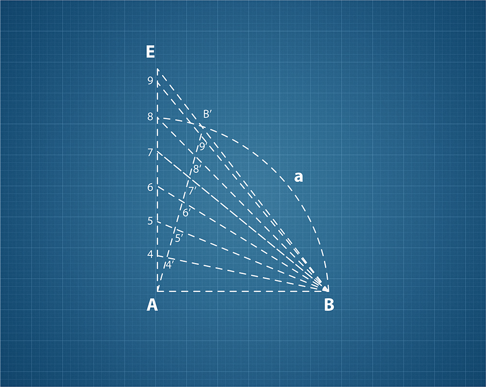 -> On a different drawing (figure a) trace an horizontal line on which the length of AB is reported. On the vertical line, the treads of the steps 3 to 8 are reported and the length of the portion of the tread from the ninth step which is cut by the line BD (Point E). -> Each tread on the line AE is then linked to point B. - -> Then trace an arc with A as a center, the radius is AB. This arc cuts the BE line on the point B'. -> The new length of the treads are found on the line AB'. This distances are to be reported on the AB line of the first drawing.
